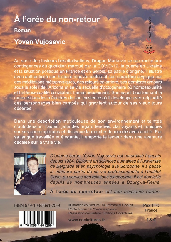 |  A propos de l'auteur... | D'origine serbe, Yovan Vujosevic est naturalisé français depuis 1984. Diplômé en sciences humaines à l'université de Belgrade et en psychologie à la Sorbonne, il a passé la majeure partie de sa vie professionnelle à l'Institut Curie, au service des relations extérieures. Il est domicilié depuis de nombreuses années à Bourg-la-Reine. À l'orée du non-retour est son troisième roman.